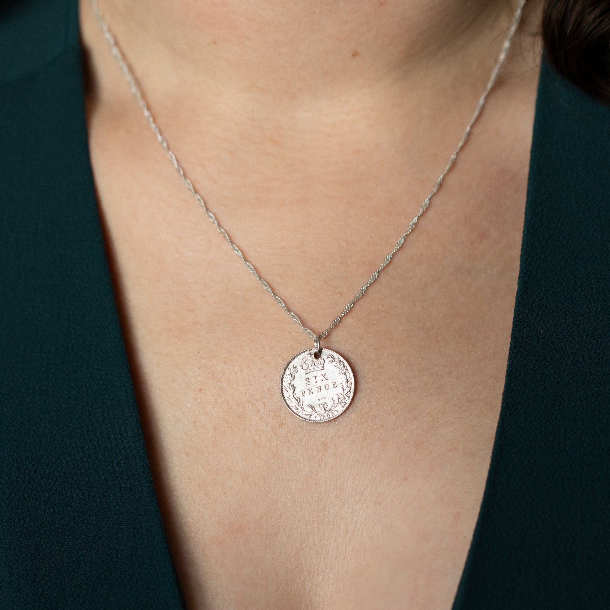 A sterling silver sixpence piece from 1906, transformed into a pendant.