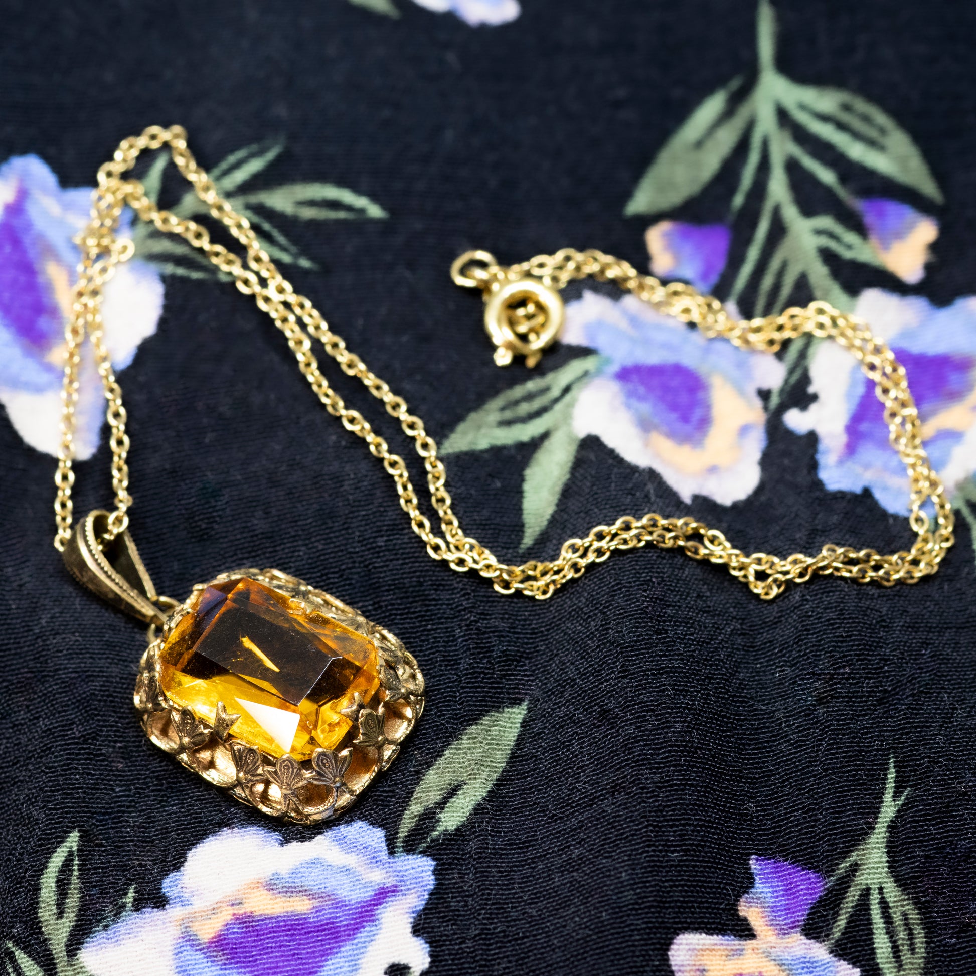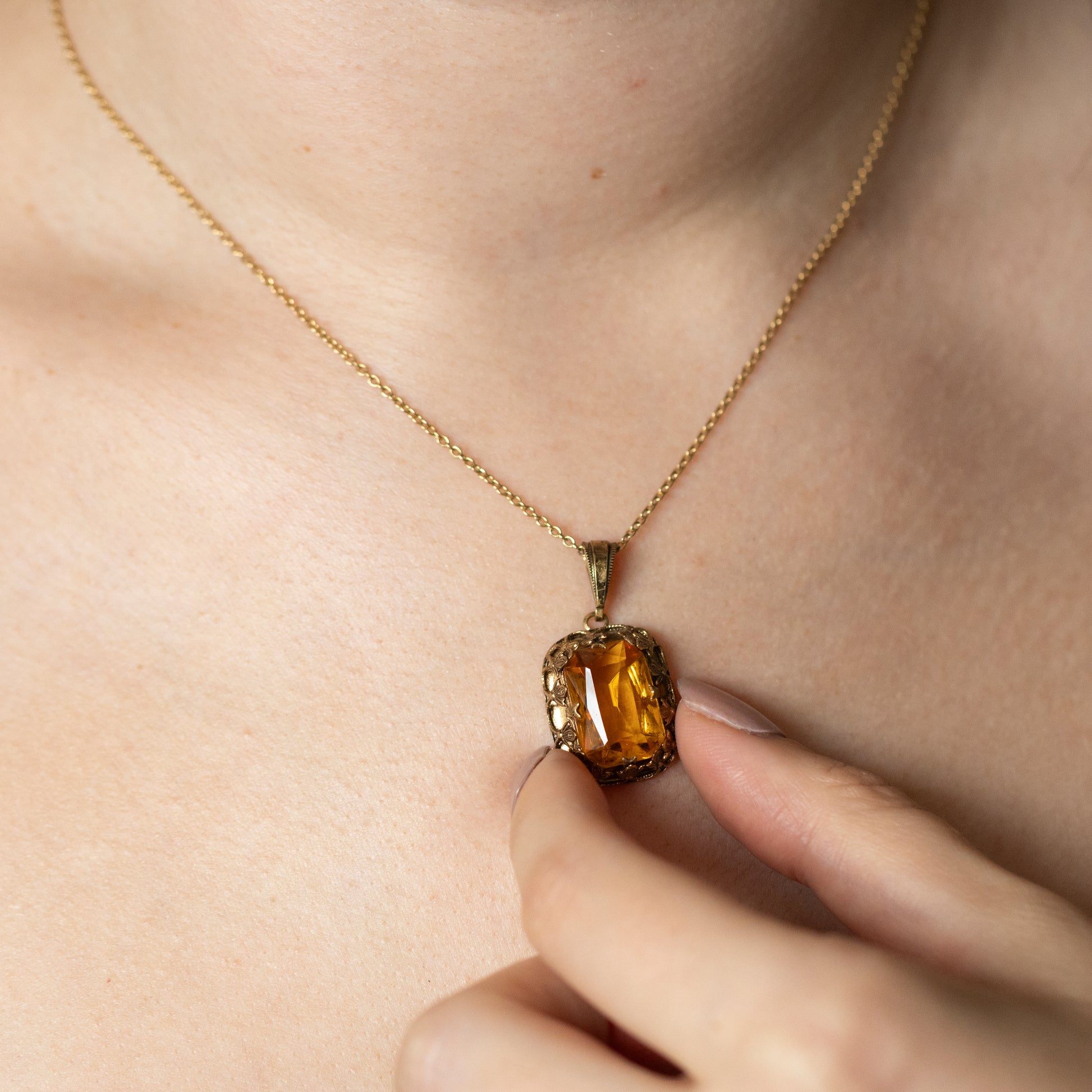 A vibrant, octagon cut orange stone pendant within a decorative, Art Deco style openwork frame, on a gilt coloured chain.