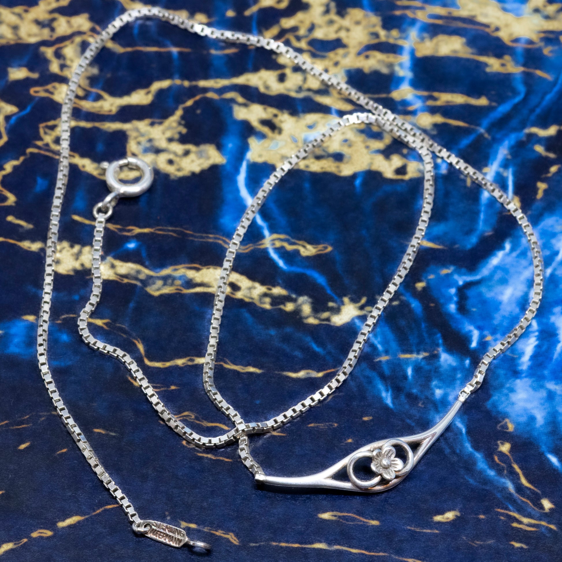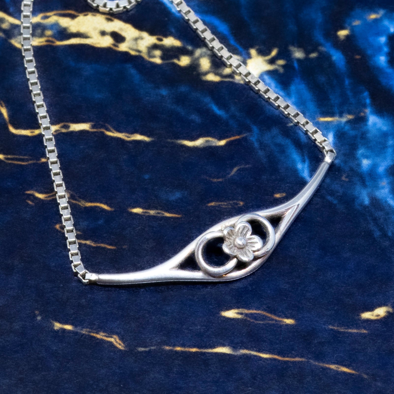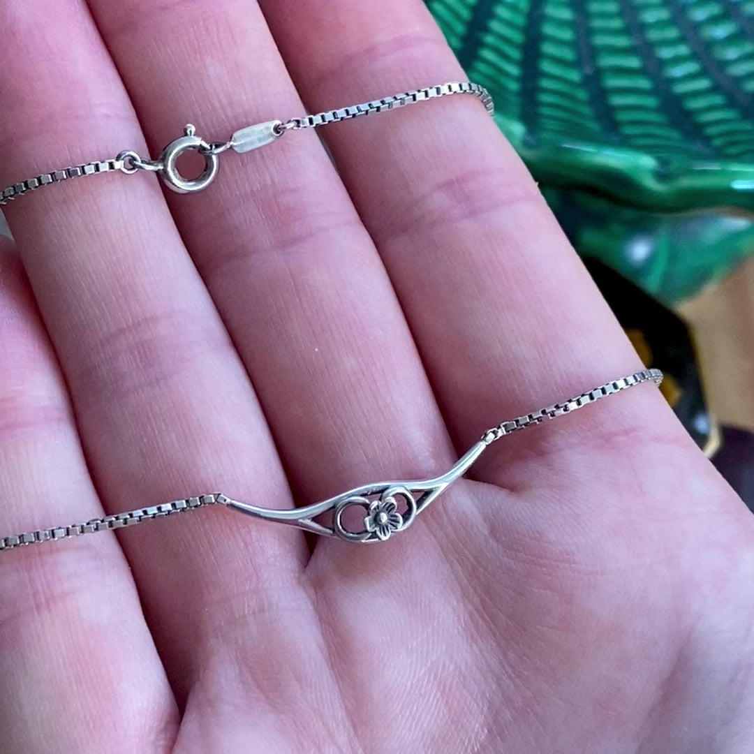 A dainty, floral design collar, on a fine box link chain.